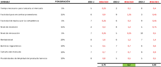 Por último, aplicamos el % de ponderación de cada variable a cada evaluación numérica de cada una de las ideas: